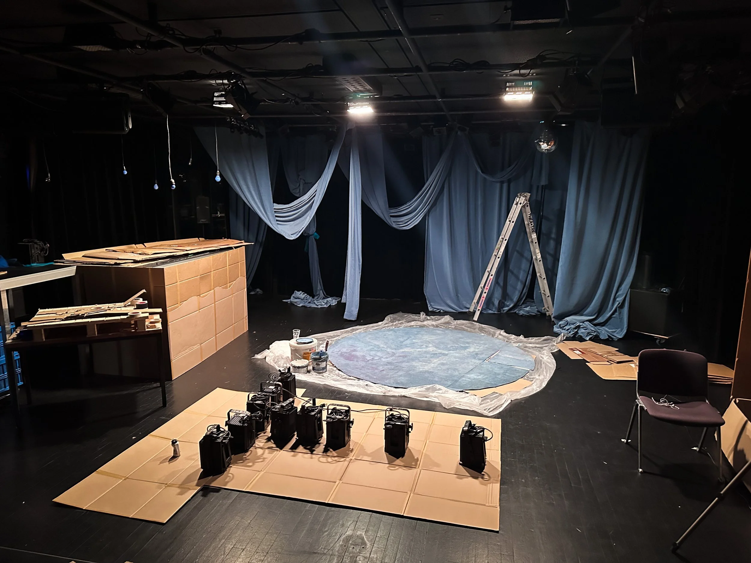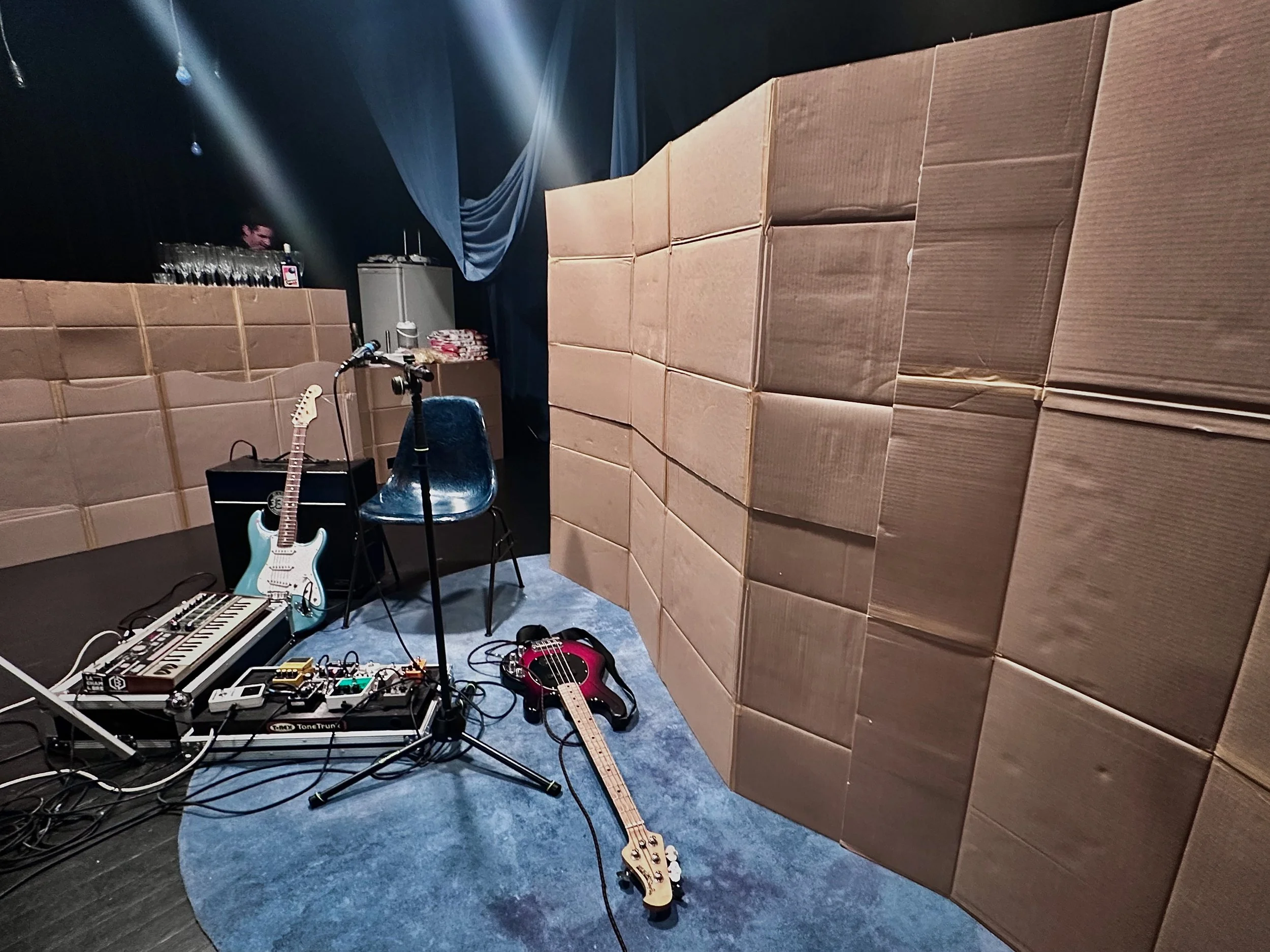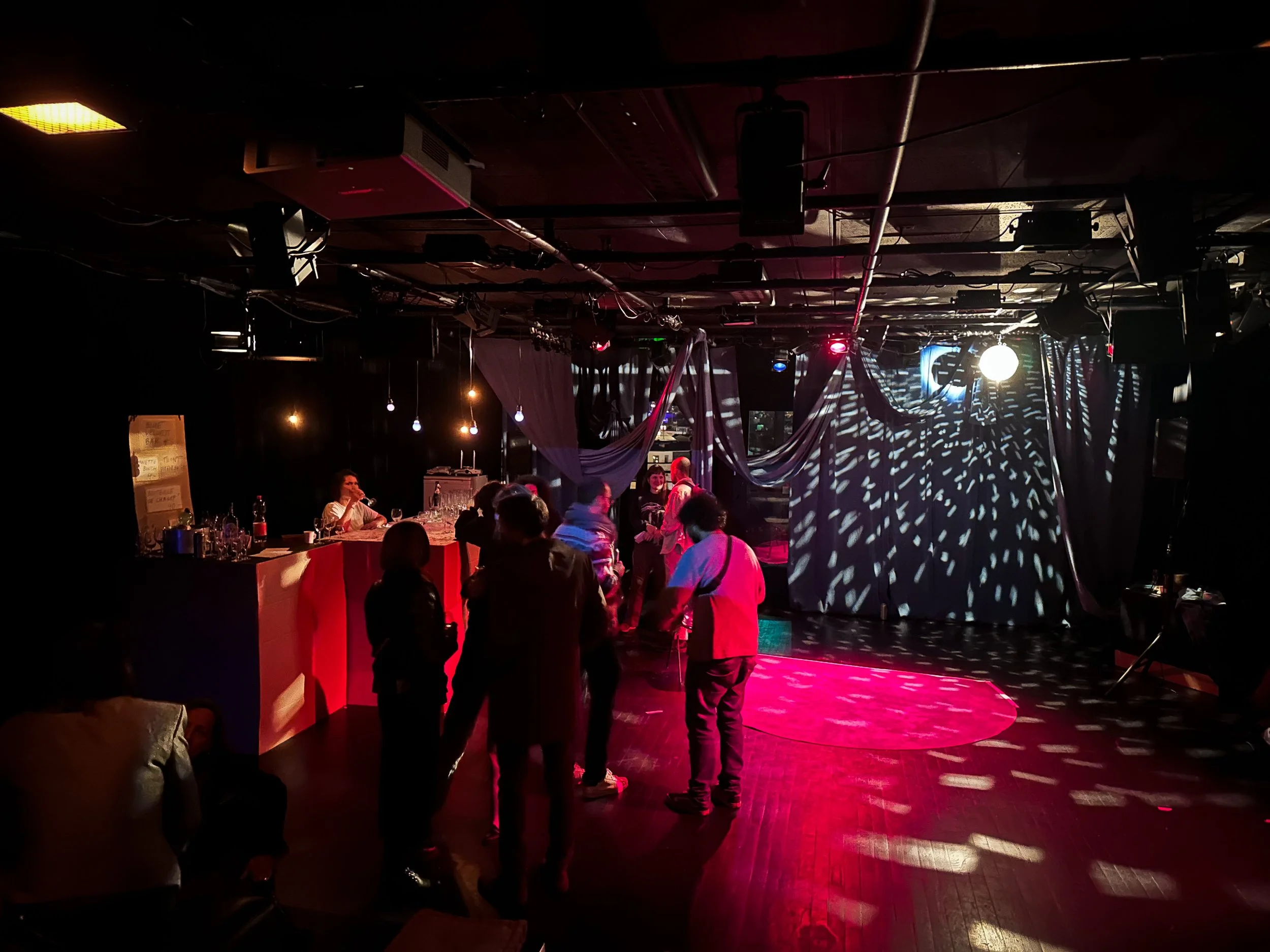Fête / Joie / Paillette / Artistes en dépression / Musique et inspiration / Facettes et volutes / Bar en carton / Champagne en bouteille / Bière en palette / Hot dog avec toutes petites frites / Terrasse / Machine à fumée / Piste de danse en velours bleu.