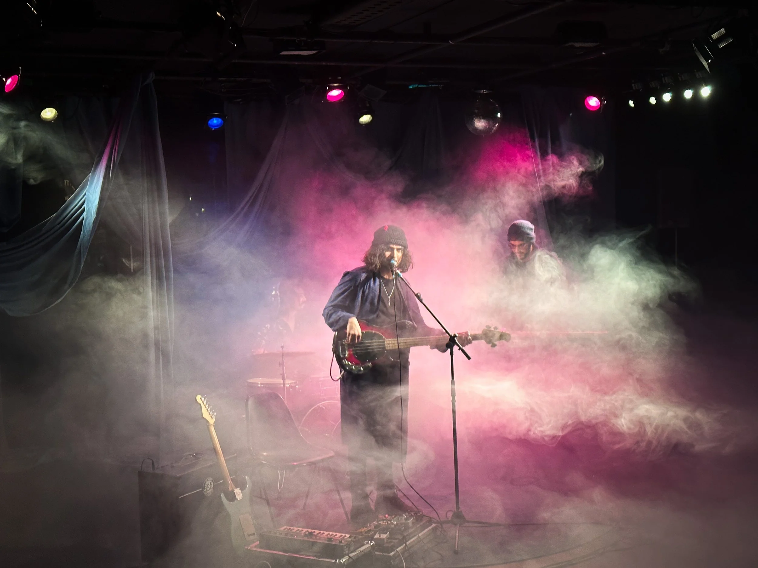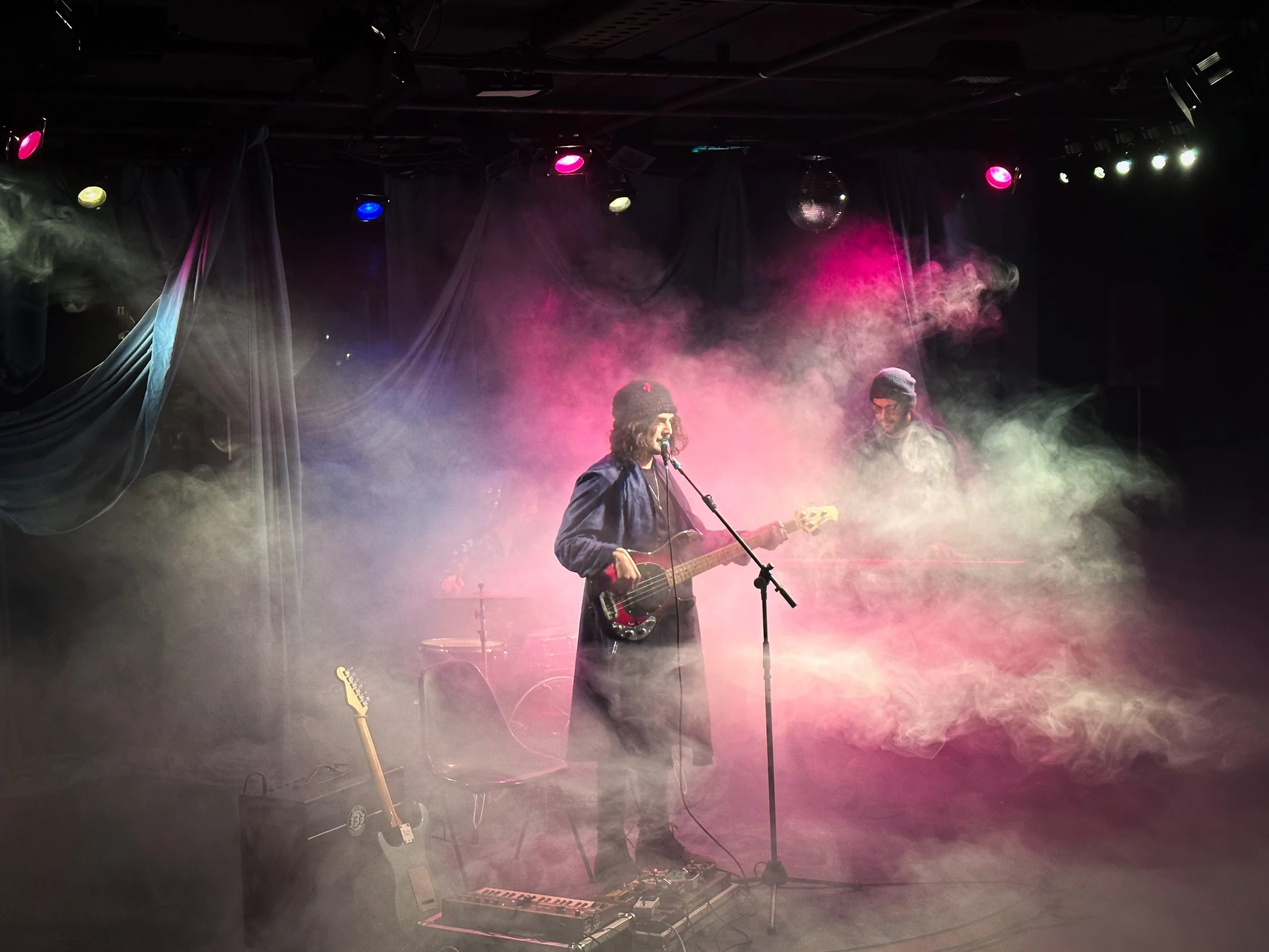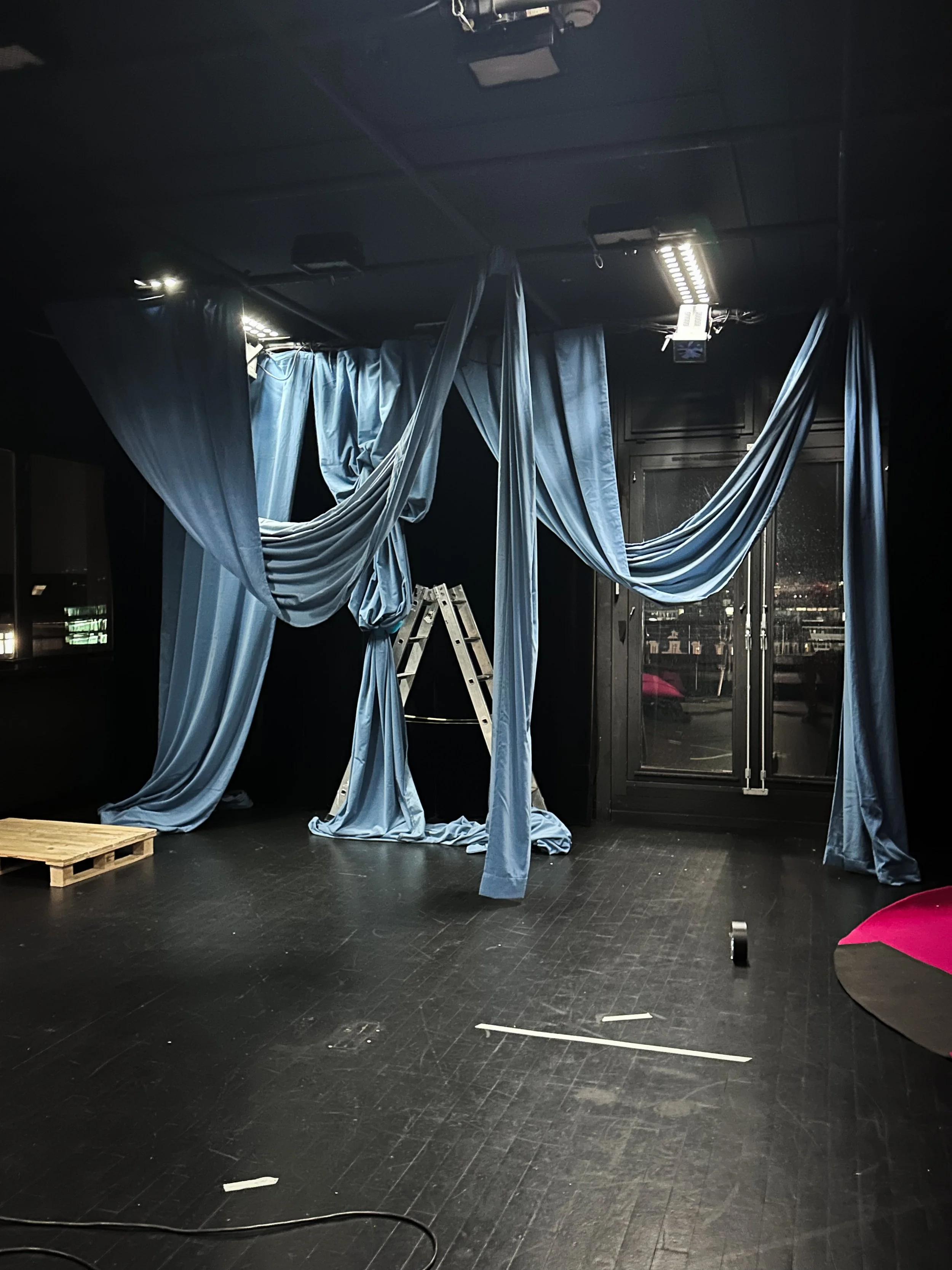 Fête / Joie / Paillette / Artistes en dépression / Musique et inspiration / Facettes et volutes / Bar en carton / Champagne en bouteille / Bière en palette / Hot dog avec toutes petites frites / Terrasse / Machine à fumée / Piste de danse en velours bleu.
